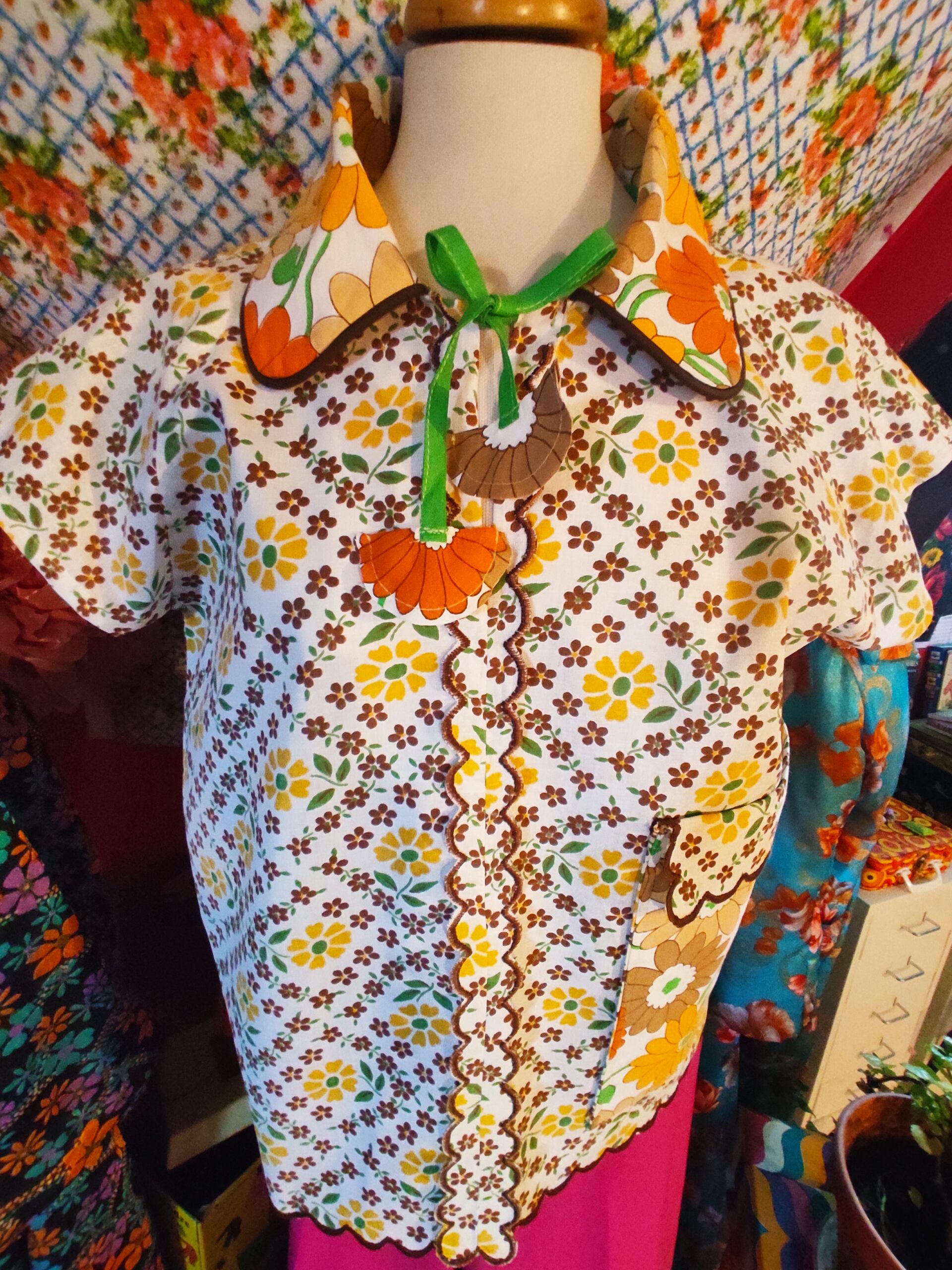 Cette blouse unique convient aux tailles 38/40 â assez ample pour danser, assez chic pour bruncher chez mamie.