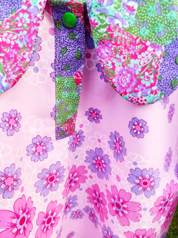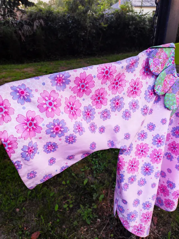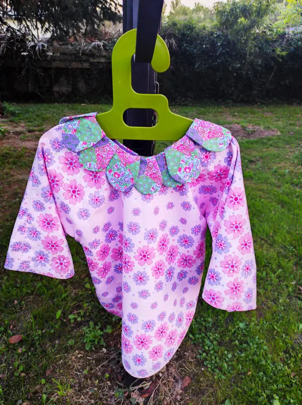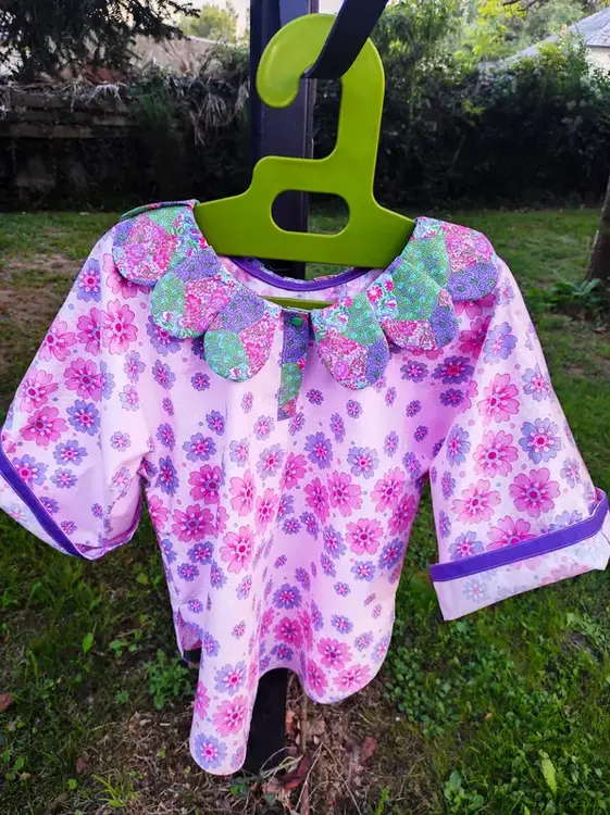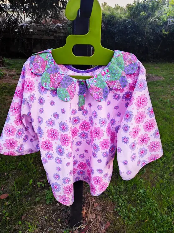 Pièce unique réalisée à partir de draps vintage fleuris 💜💗. Son col pétales multicolores lui donne une touche poétique et ludique 🌿🌼. Les manches sont légèrement amples avec un joli détail violet pour une finition soignée 💫.