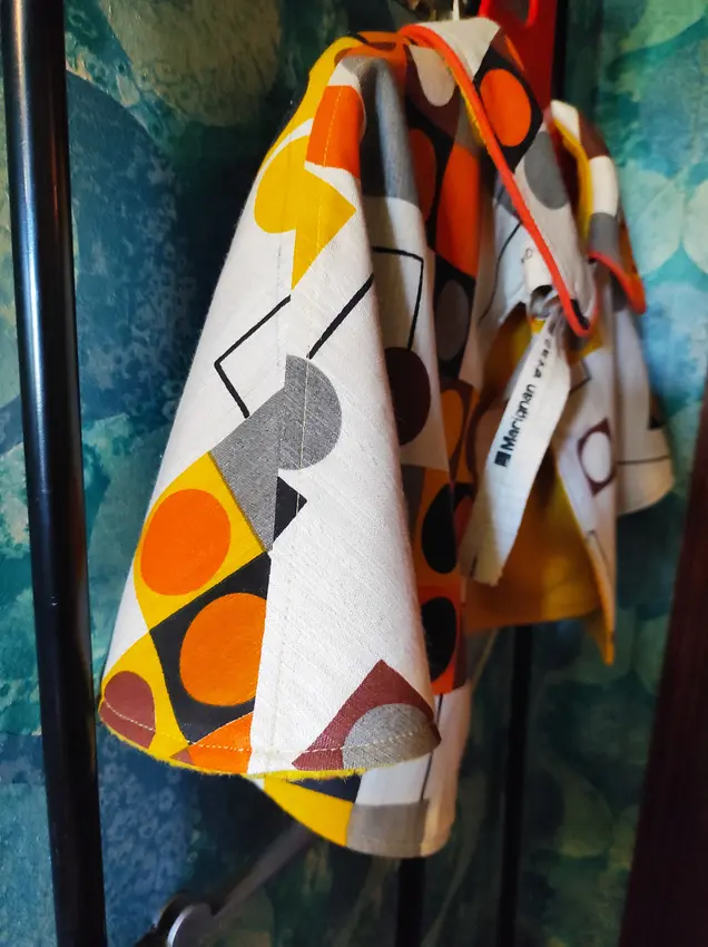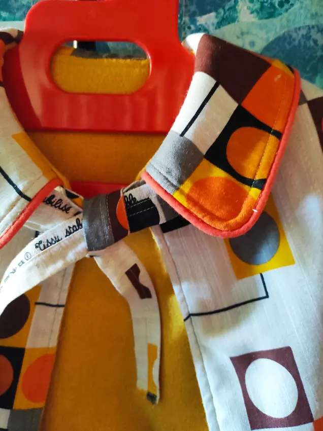 D’un côté, un tissu graphique années 70 aux motifs géométriques orange, marron et moutarde, pour un look audacieux et plein de caractère.