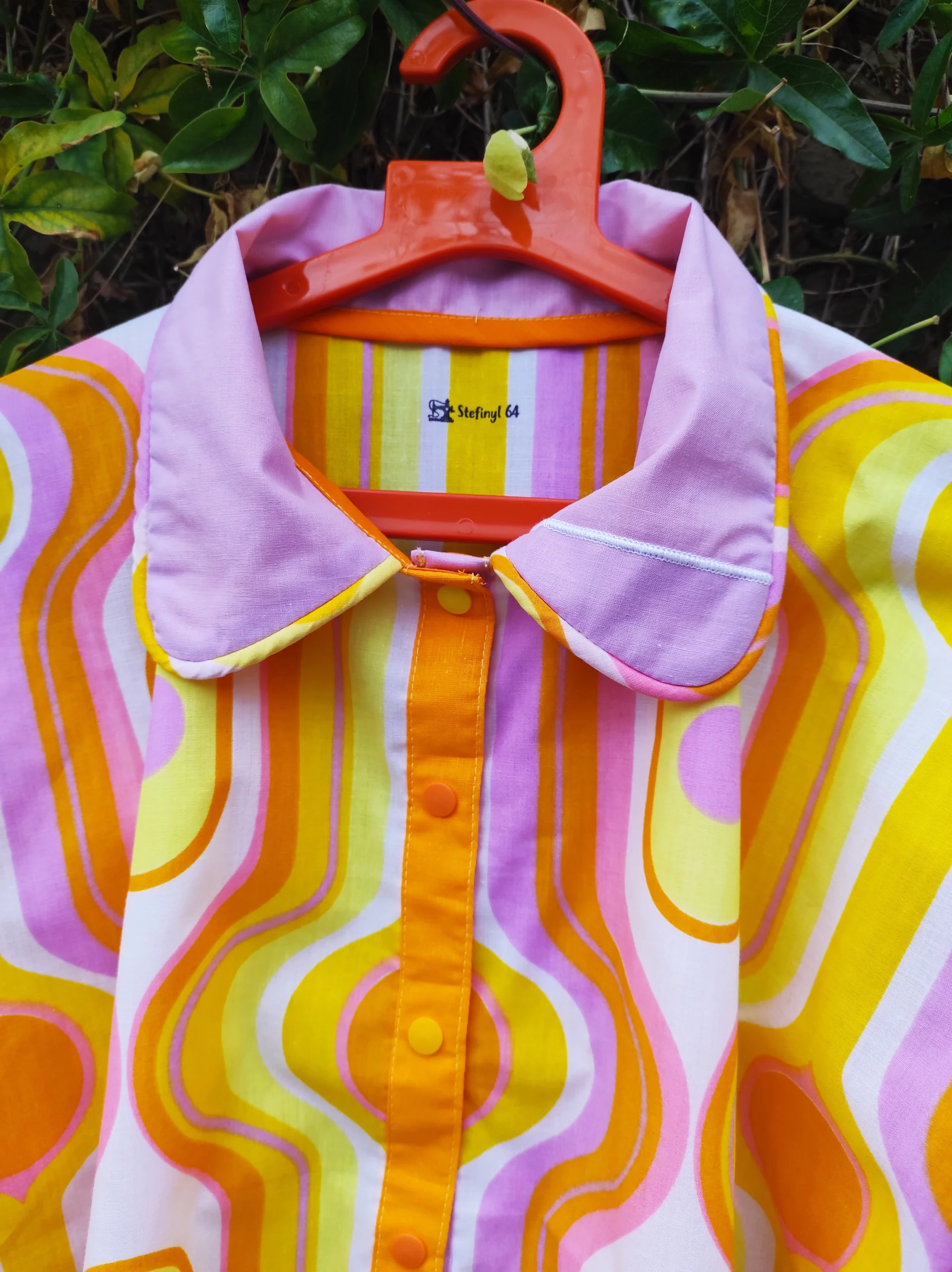Motifs hypnotiques, couleurs orange pop, rose bubblegum et jaune citron : un cocktail rétro qui ferait pâlir Travolta.