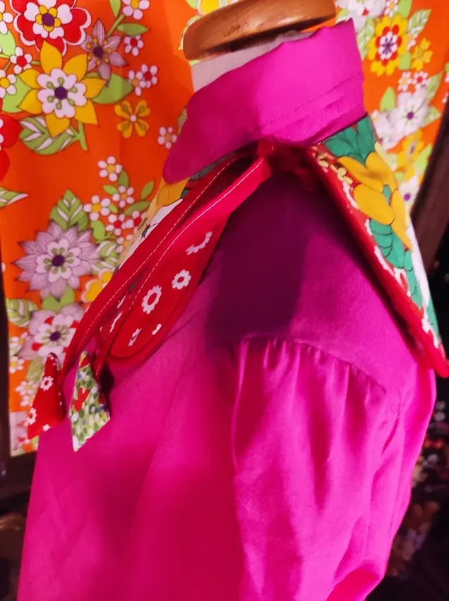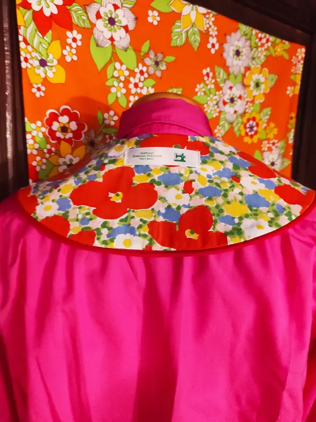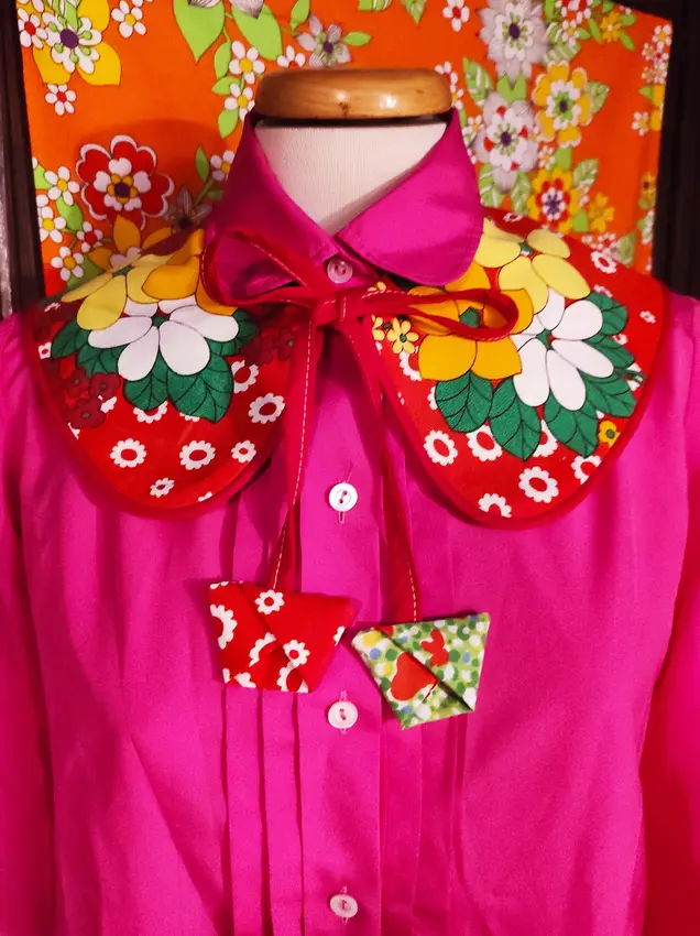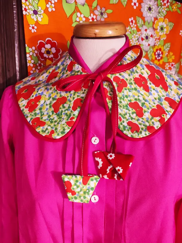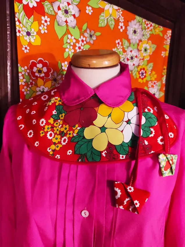 Ce col réversible a été confectionné à partir de draps authentiques des années 70, soigneusement sélectionnés pour leurs couleurs éclatantes et leurs motifs rétro irrésistibles.