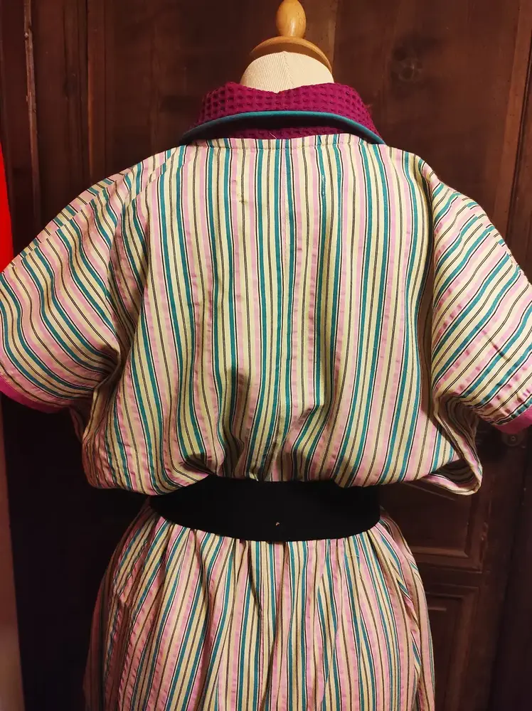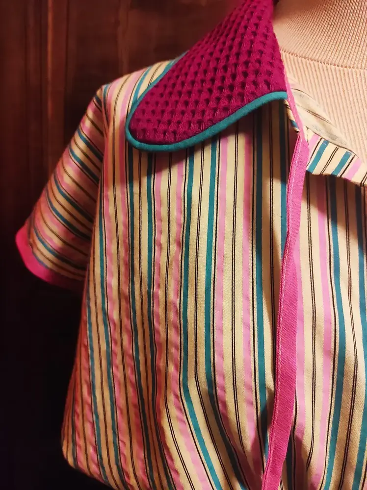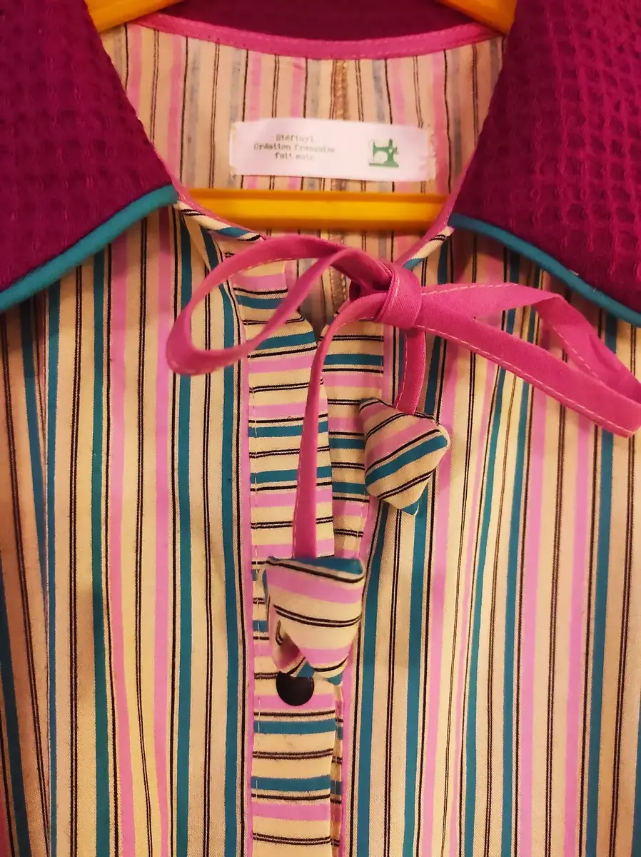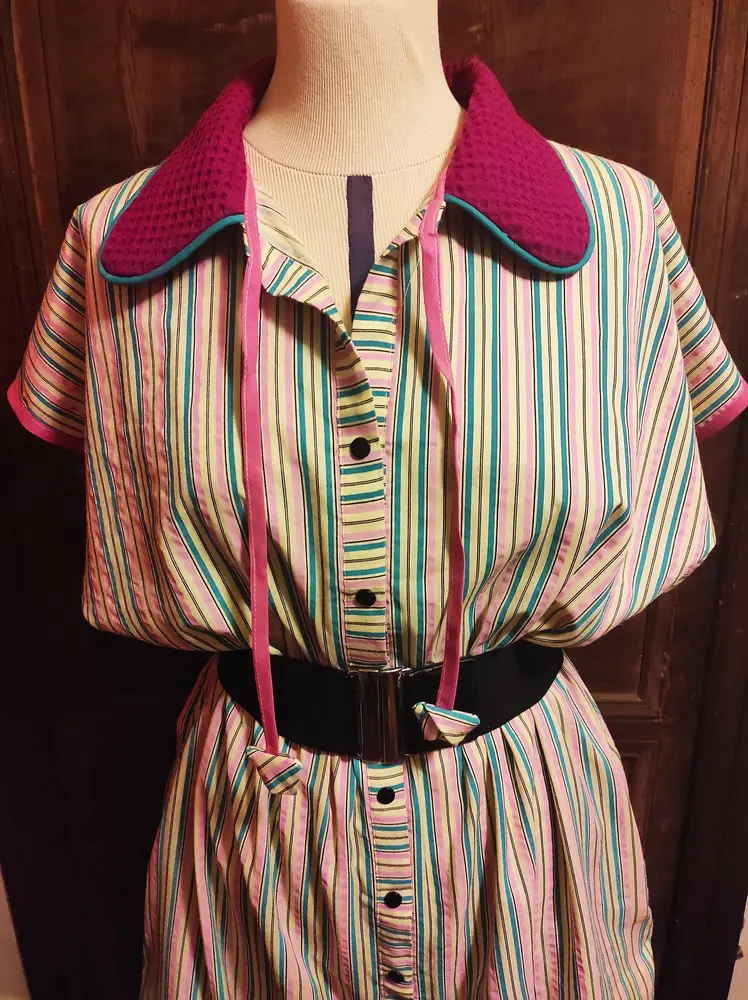 • Col Texturé Contrastant : Un large col arrondi en piqué de coton fuchsia, souligné par un liseré turquoise, pour un port de tête structuré.