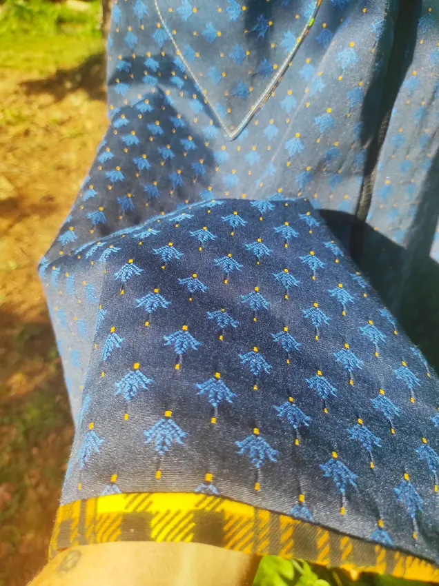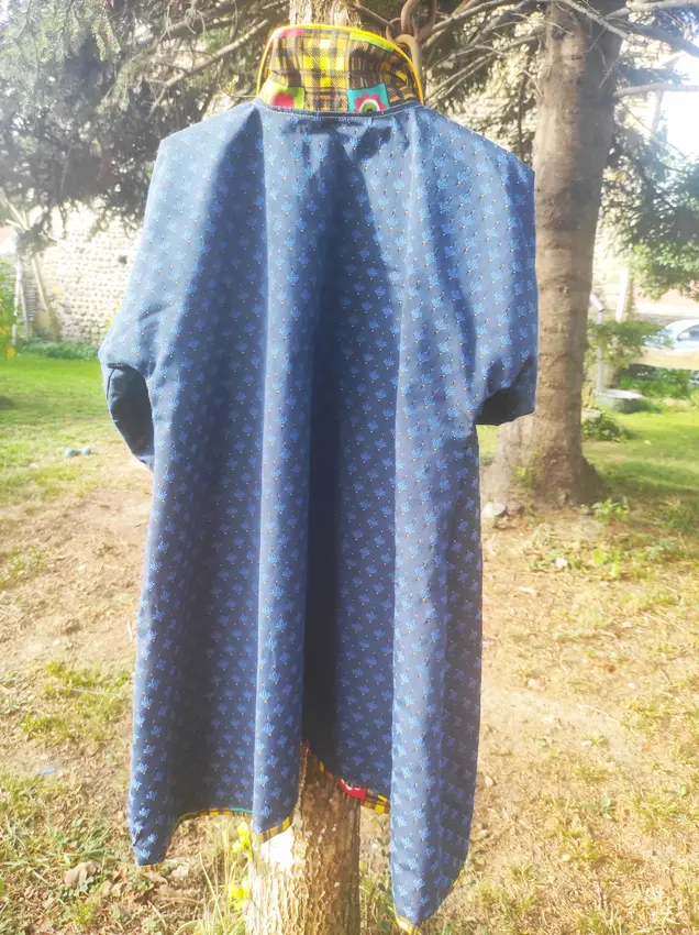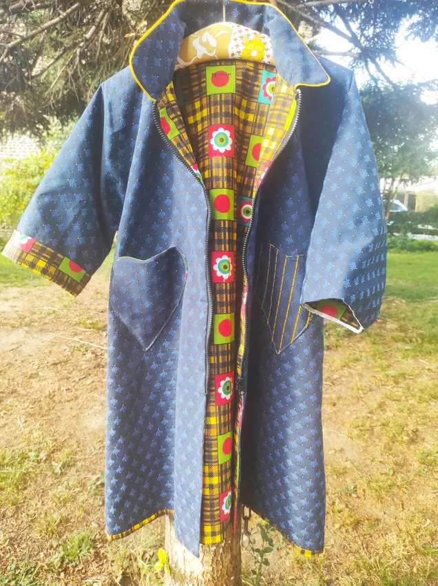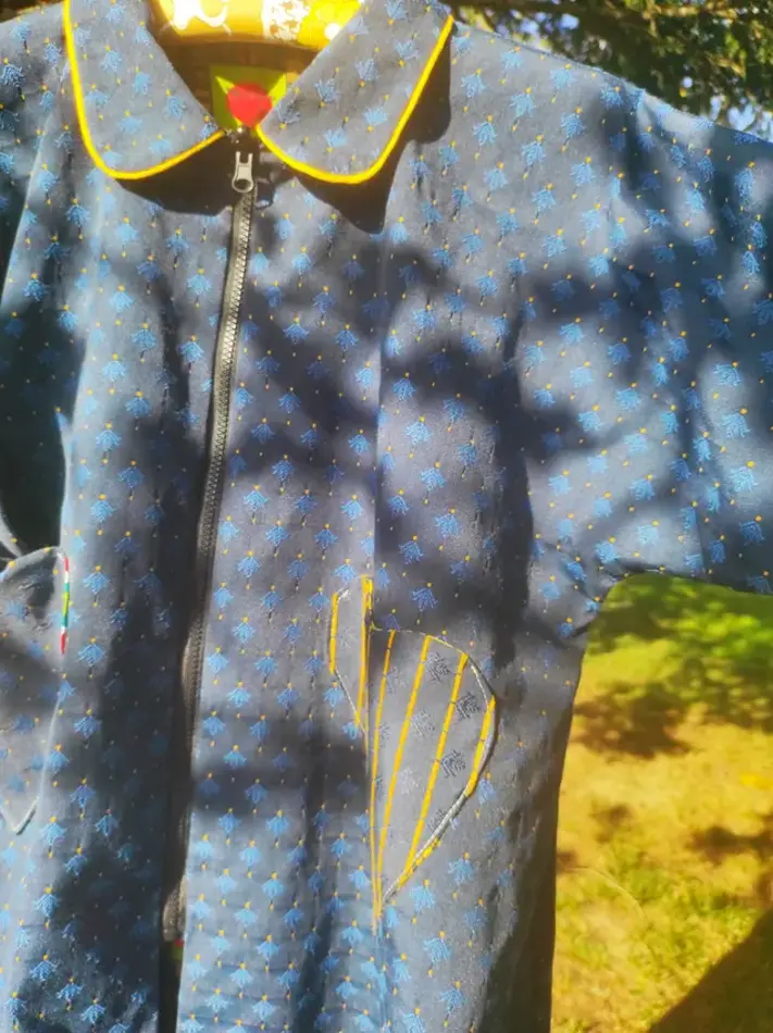 💙 Côté 2 : esprit plus doux et raffiné, dans un tissu bleu profond aux petits motifs discrets, relevé de détails contrastants : poches en forme de cœur 💛 et rappels du tissu rétro à l’intérieur des manches et sur les finitions.