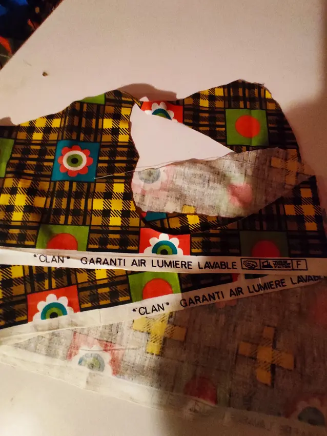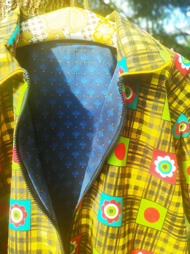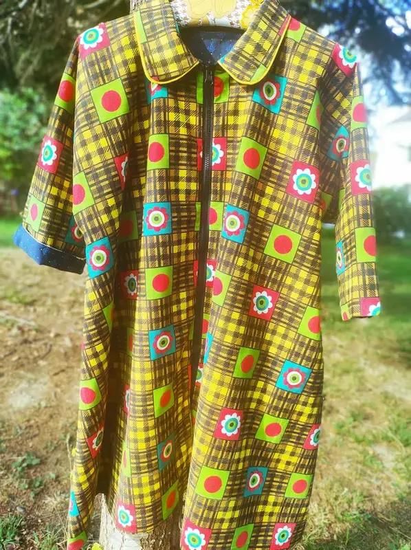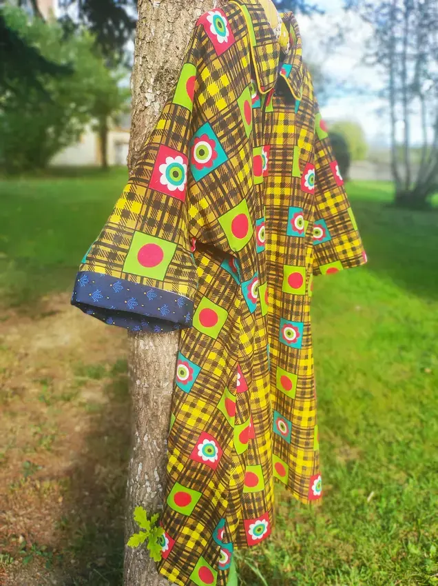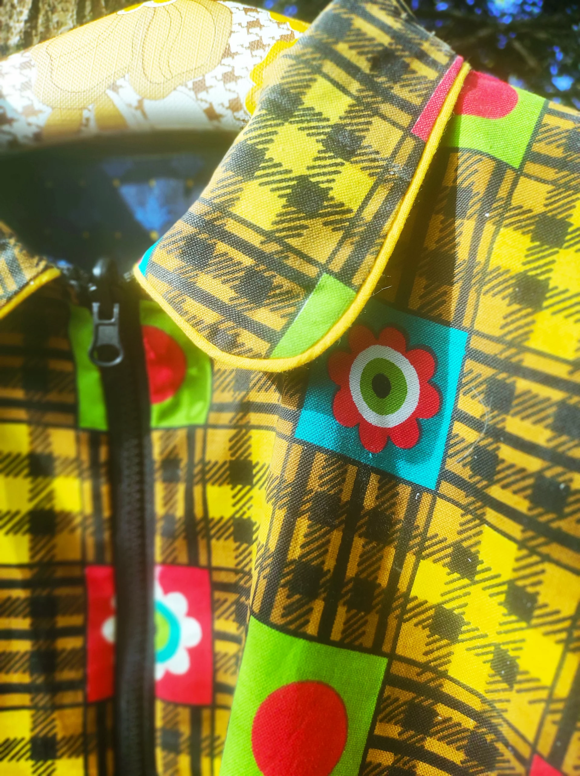 💛 Côté 1 : ambiance seventies assurée avec un imprimé géométrique vitaminé — mélange de carreaux vintage, fleurs stylisées et couleurs pop (jaune, vert, rouge, turquoise). Un vrai coup de pep’s pour affronter la grisaille avec style !