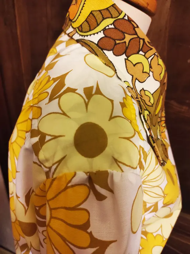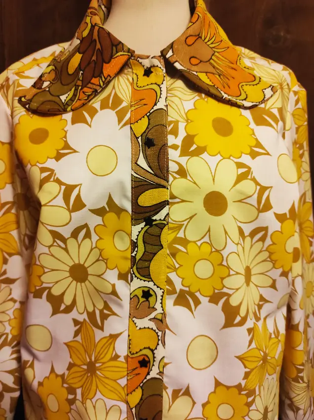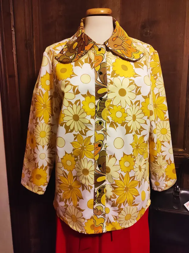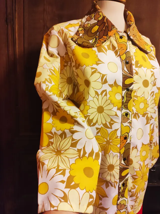 Plongez dans les annĂ©es 70 avec cette chemise unique, créée Ă  partir d’un drap fleuri et d’un rideau de la mĂȘme Ă©poque đŸŒș