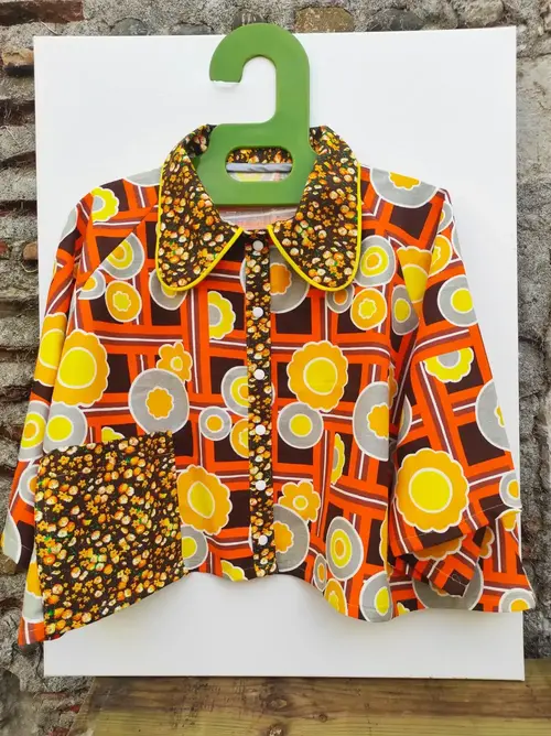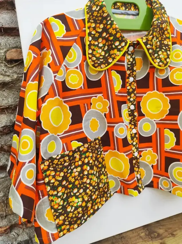 Confectionnée à partir de tissus vintage, elle présente un design unique et audacieux. Le corps de la veste est un motif géométrique orangé et marron, orné de grandes fleurs stylisées en jaune et gris. 🧡💛